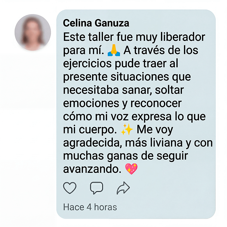 En solo 6 días, libera tu voz, activa tu energía y proyecta tu mensaje con fuerza con ejercicios energéticos y vocales de 20 minutos al día. Para integrar lo que abrimos en el taller y seguir activando tu voz con guía.